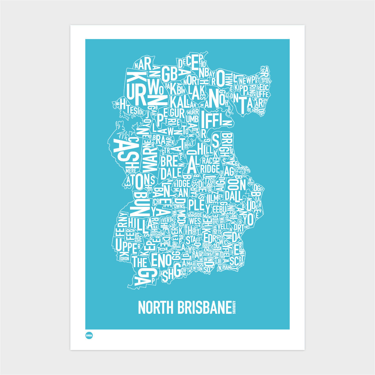 Part of our original screenprint colour series. The North Brisbane print stretches all the way to the beaches in the Moreton Bay region. Show some Brissy pride with a print on your wall.