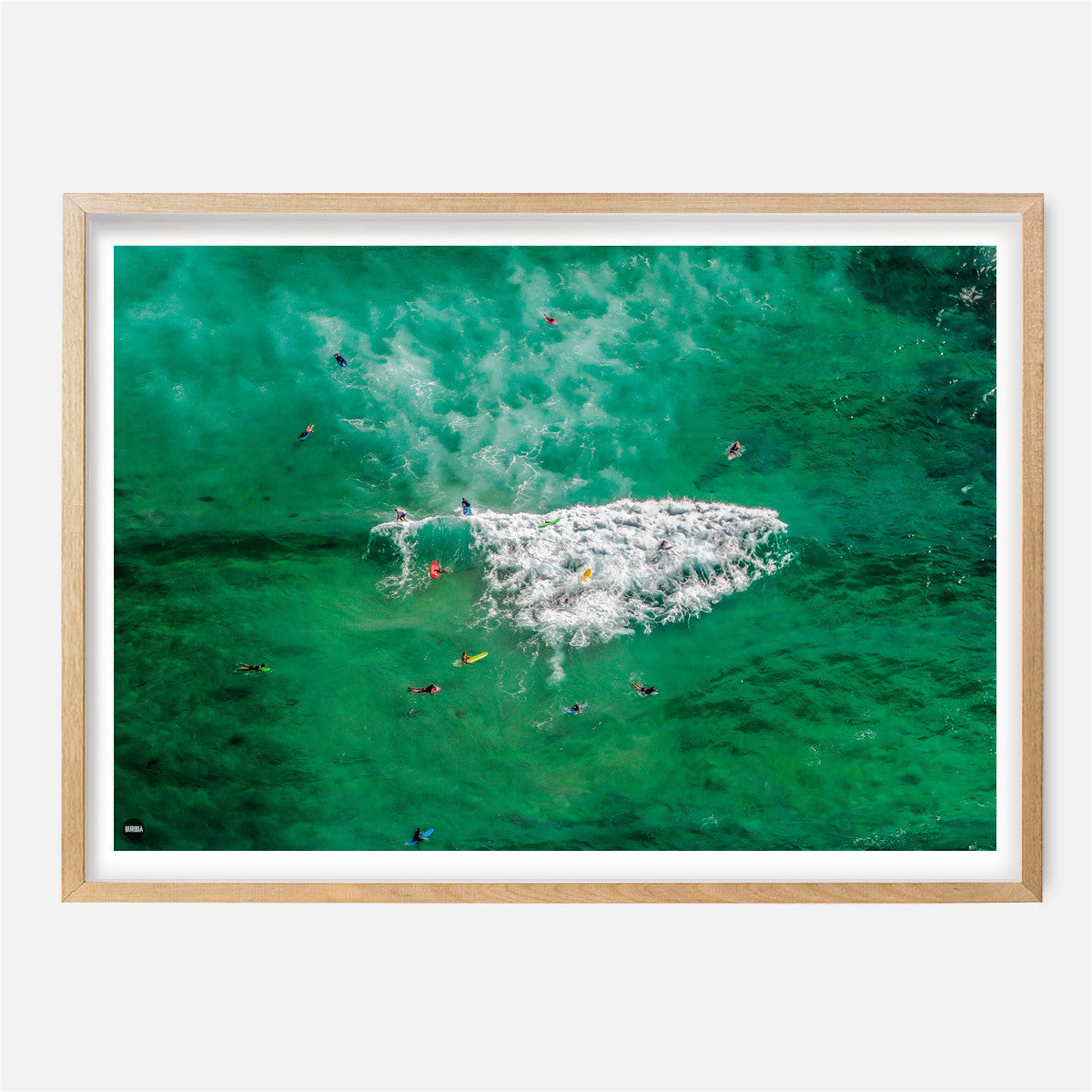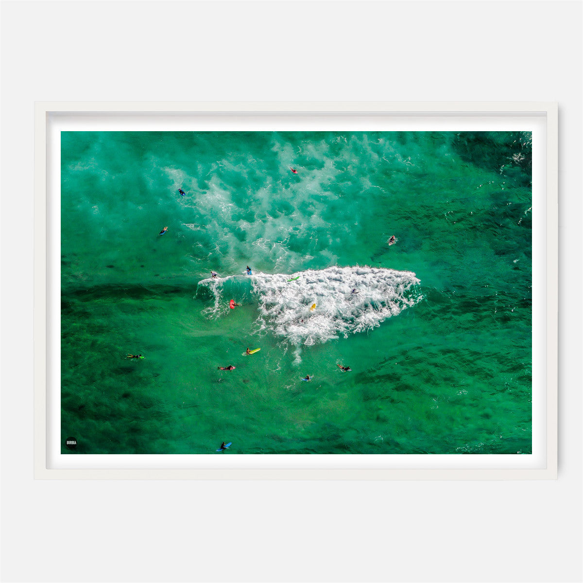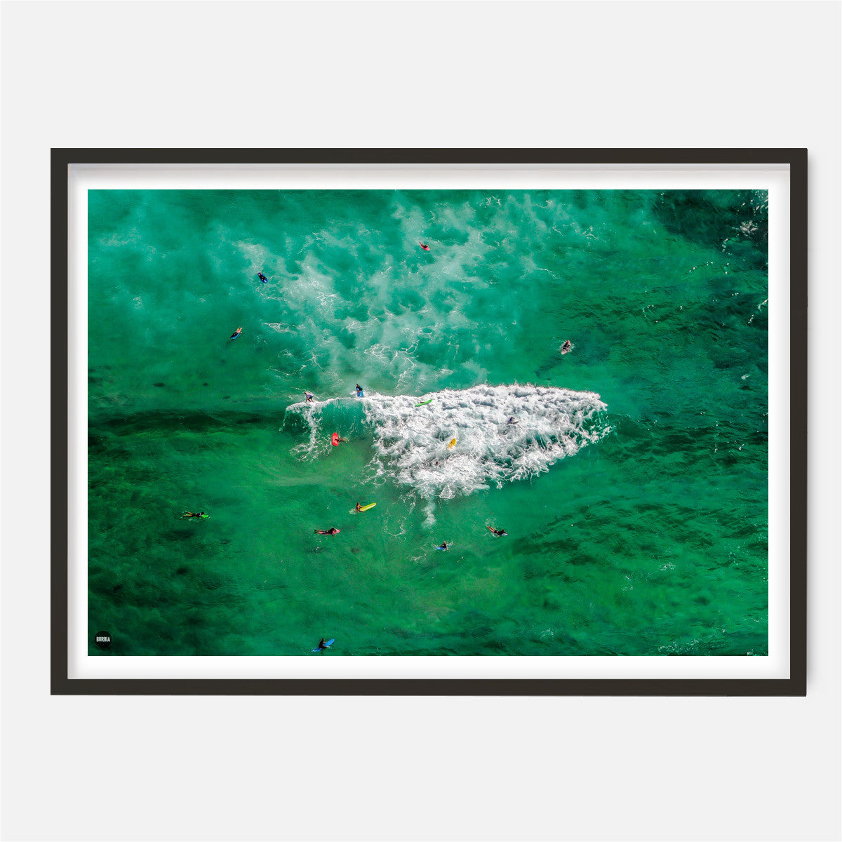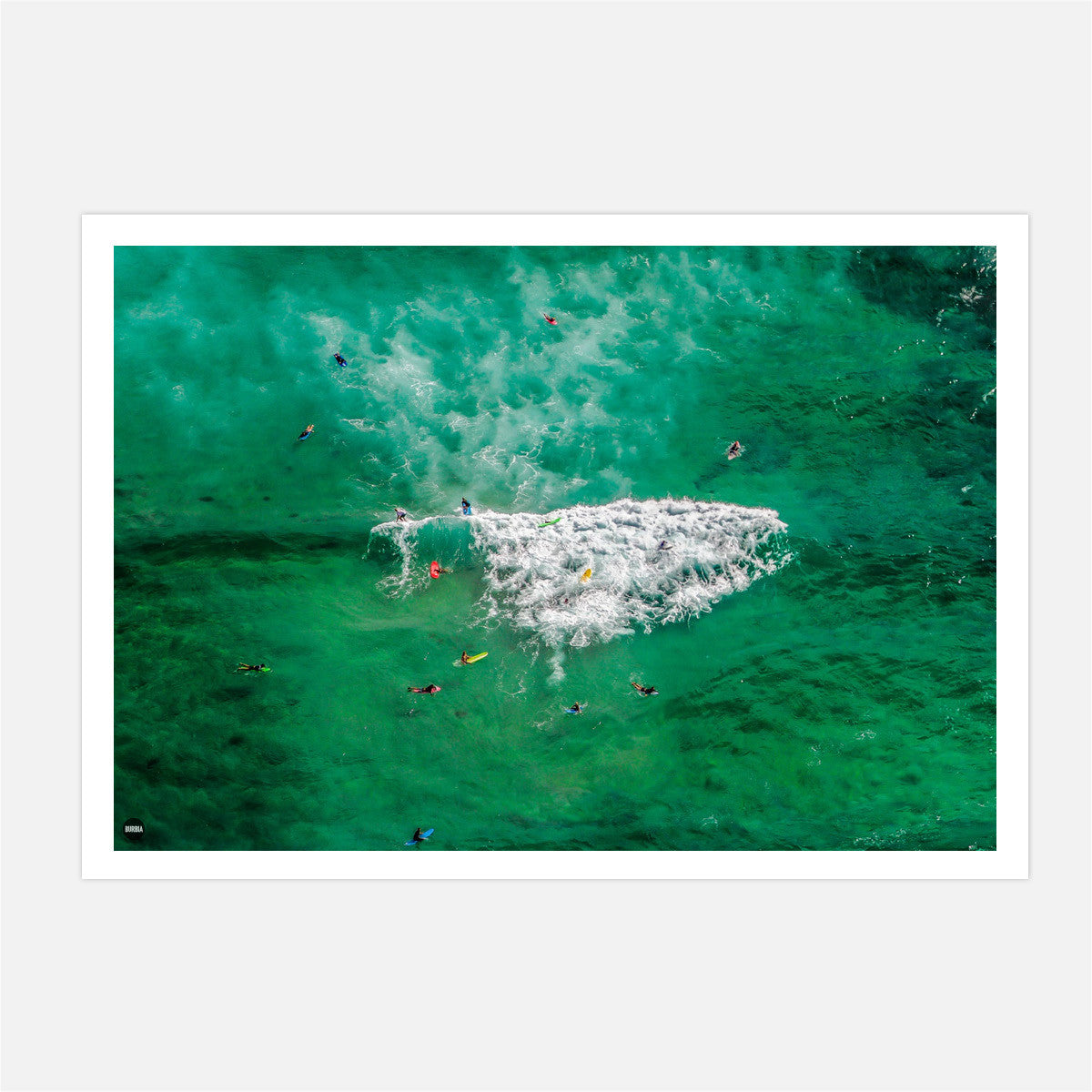 On a surfers sea of green, a fish head takes shape amongst the waves. Brighten up your home with the shapes and textures of the surfers in the tide. Taken over the shores of Tamarama Beach, Sydney.
